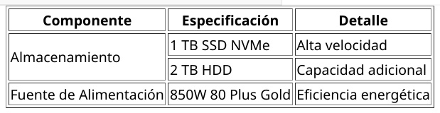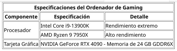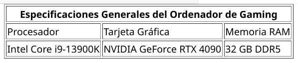 <caption align="top">Especificaciones Completas del Ordenador de Gaming</caption>