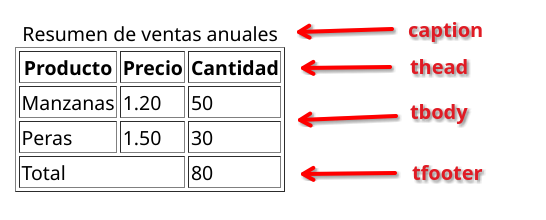 <tfoot>: Agrupa el pie de la tabla, que generalmente contiene resúmenes o totales. Es útil porque se puede definir el resumen o pie de una tabla y, al imprimirse, se coloca en la parte inferior de cada página.