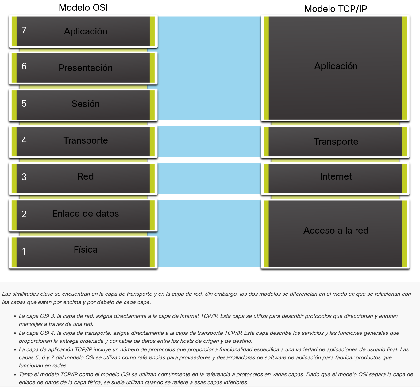 Nota: mientras las capas del modelo TCP/IP se mencionan solo por el nombre, las siete capas del modelo OSI se mencionan con frecuencia por número y no por nombre. Por ejemplo, la capa física se conoce como Capa 1 del modelo OSI, la capa de enlace de datos es Layer2, y así sucesivamente.