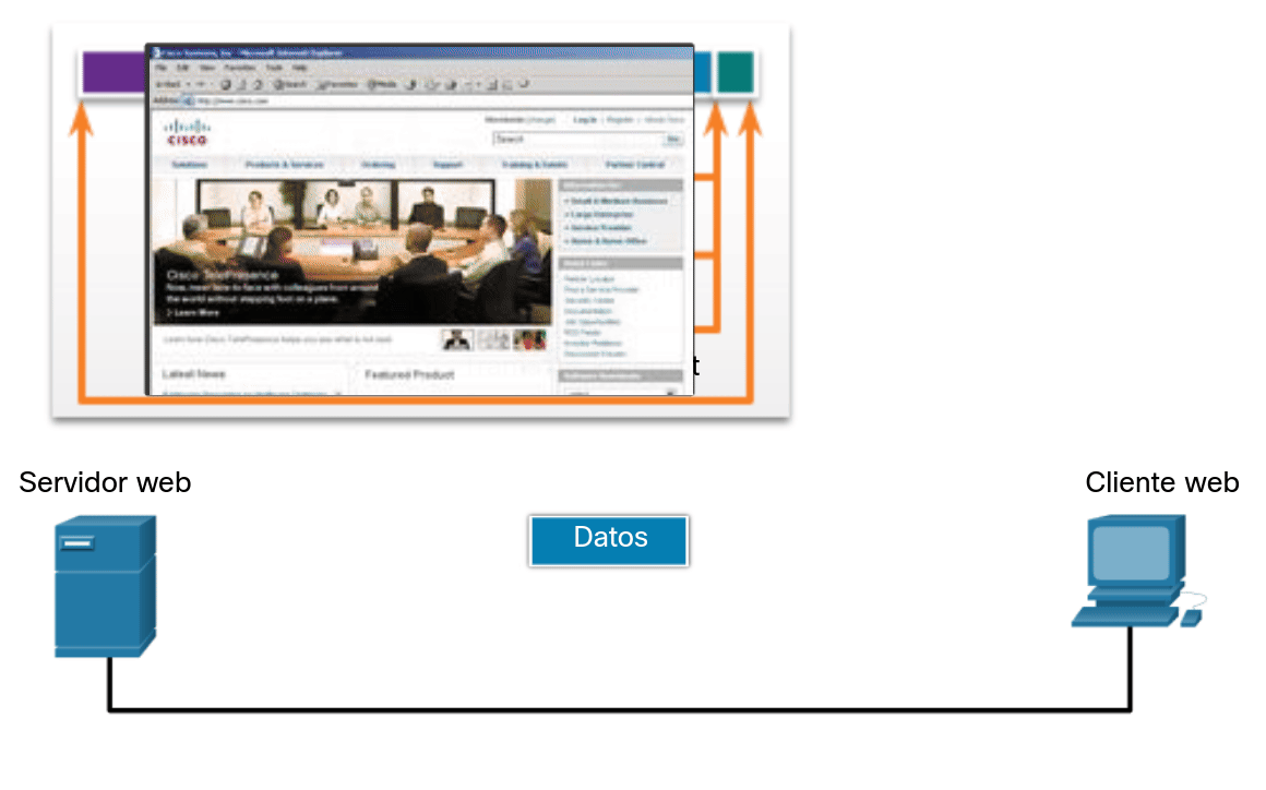 Las imágenes muestran el proceso de comunicación completo mediante un ejemplo de servidor web que transmite datos a un cliente.