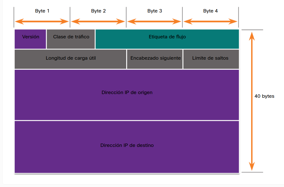 En la figura, los campos del paquete de Protocolo de Internet versión 6 (IPv6) identifican el origen del paquete y su destino.