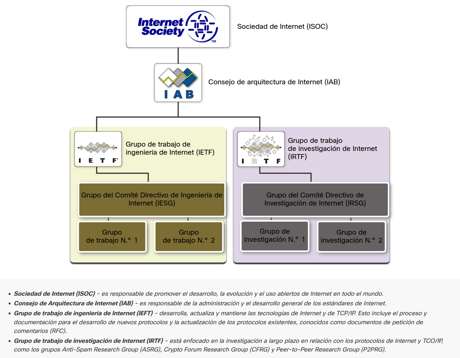 La siguiente figura muestra las organizaciones de estándares involucradas en el desarrollo y soporte de TCP/IP e incluyen IANA e ICANN.