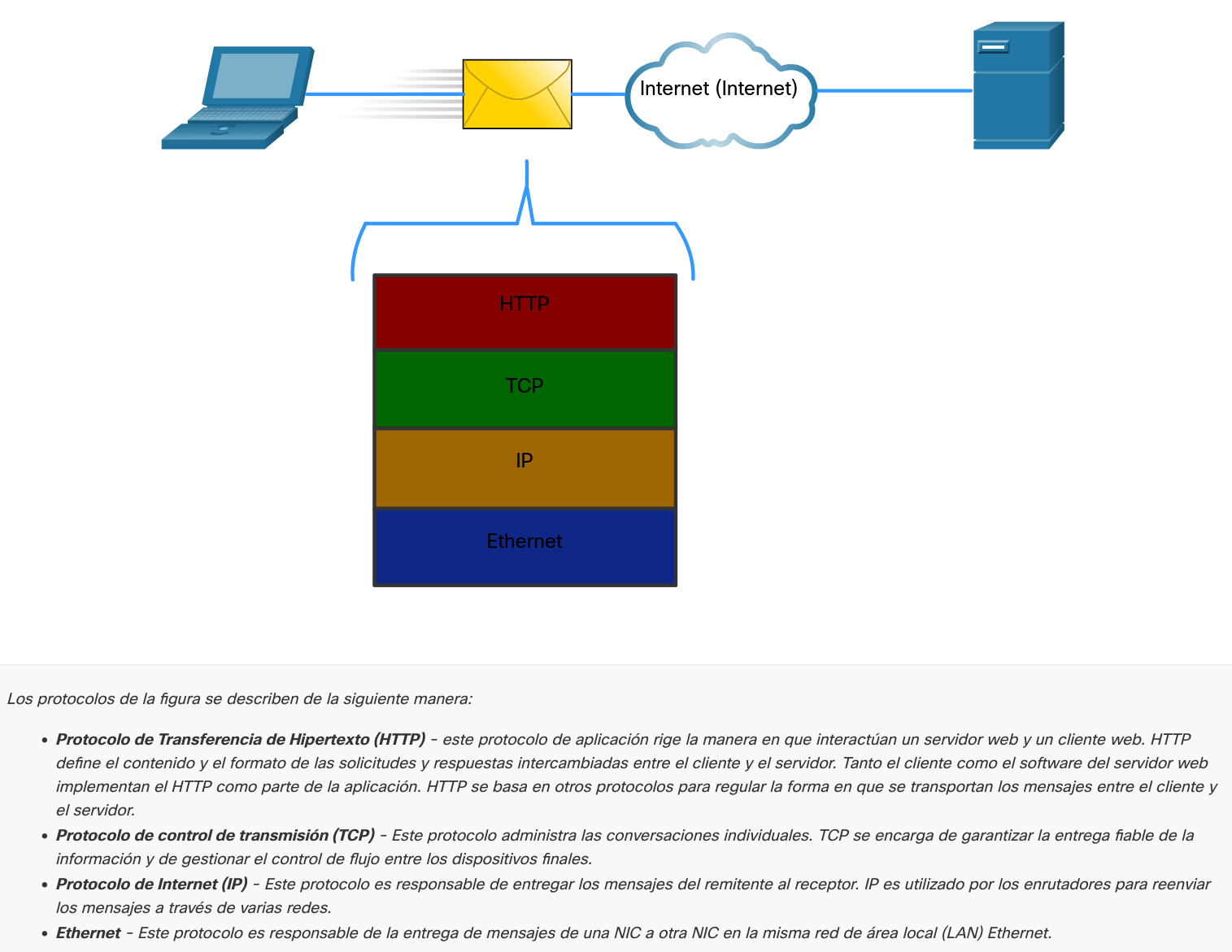 Un mensaje enviado a través de una red informática normalmente requiere el uso de varios protocolos, cada uno con sus propias funciones y formato. La figura muestra algunos protocolos de red comunes que se utilizan cuando un dispositivo envía una solicitud a un servidor web para su página web.