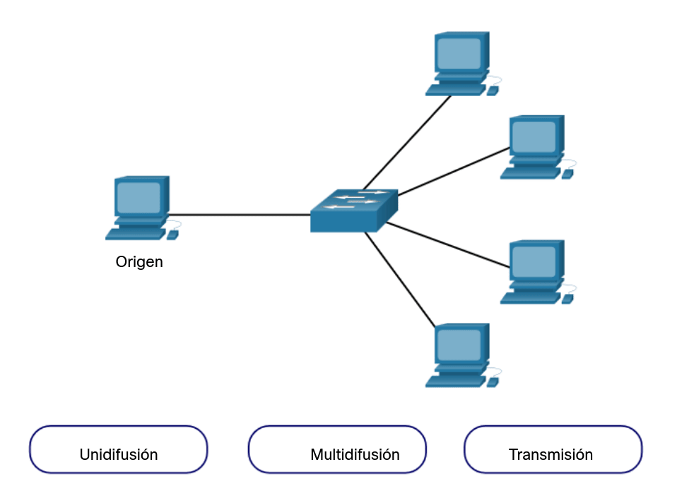 - Broadcast o transmisión - La información se transmite a todos los dispositivos finales.